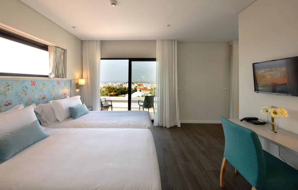 Dimensão: 25 m2 Tipo de quarto: Duplo. Tipos de cama: 2 camas Individuais Comodidades do quarto: Duche, TV via satélite, Telefone, Ar-condicionado, Secador de cabelo, Secretária, Produtos de Higiene Pessoal gratuitos, acesso à Internet. Todos os quartos desta tipologia dispõem de varanda (8m2), localizados no ultimo piso com Vista Mar.
